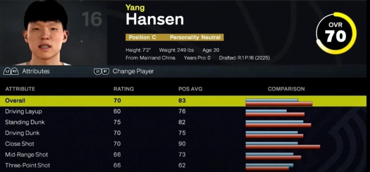 8月26日消息,《NBA 2K26》正式公布了杨瀚森的详细能力值数据。